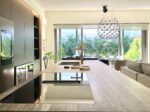 Ampio soggiorno open space con cucina all’americana “Zampieri” e tavolo in cristallo fronte giardino. Scala interna in legno e ferro con sovrastante lucernaio apribile con telecomando.