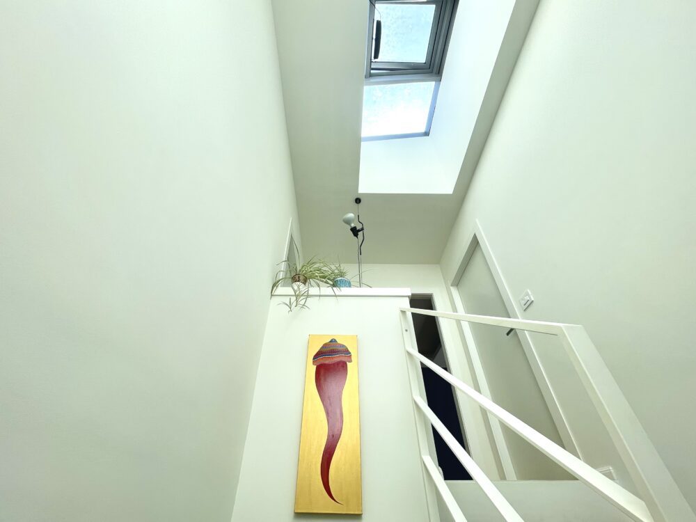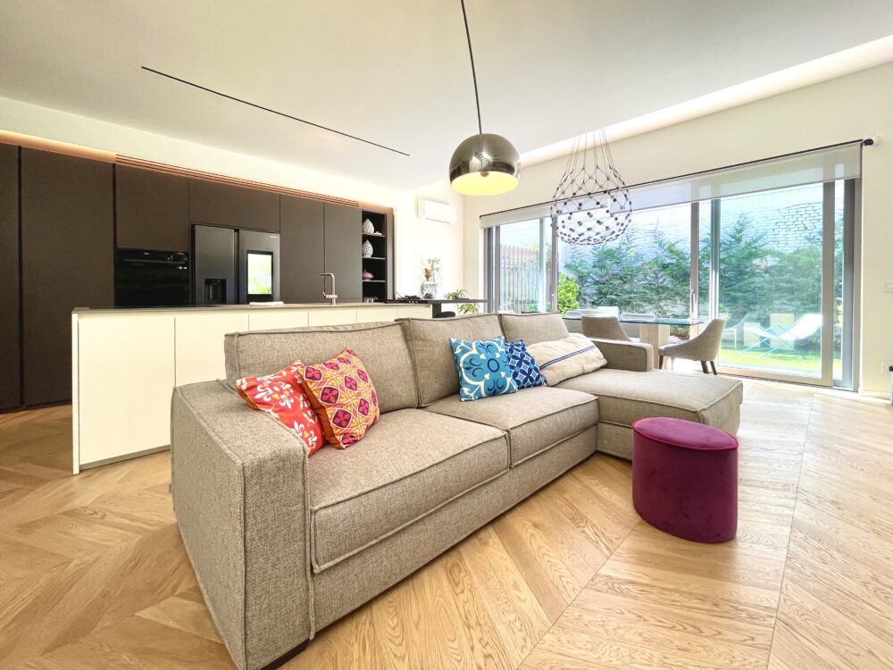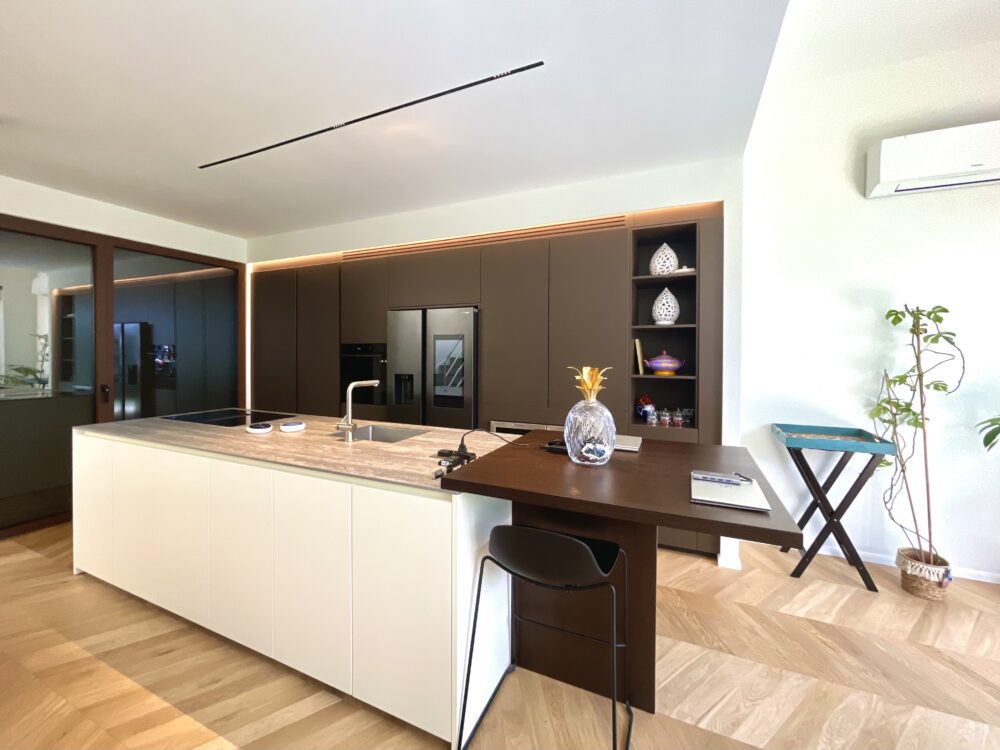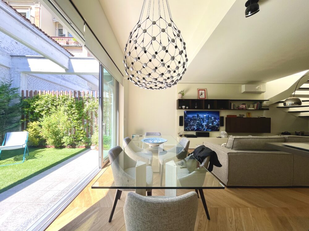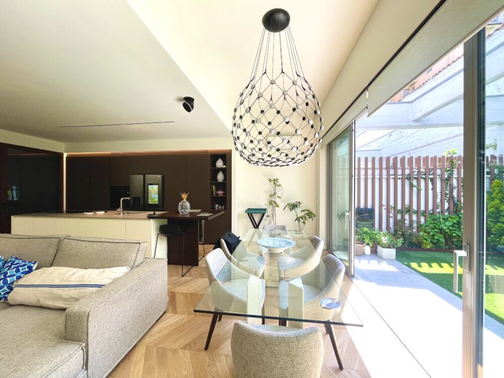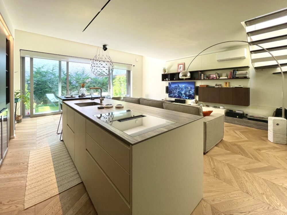 Ampio soggiorno open space con cucina all’americana “Zampieri” e tavolo in cristallo fronte giardino. Scala interna in legno e ferro con sovrastante lucernaio apribile con telecomando.