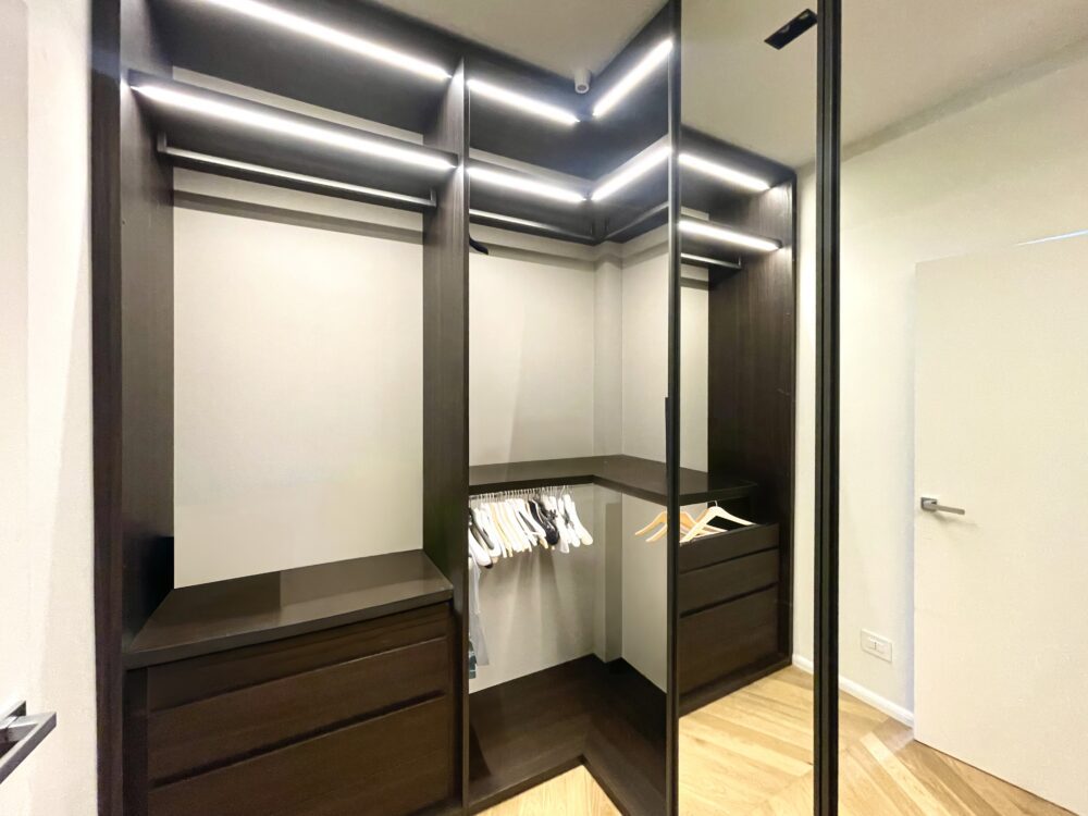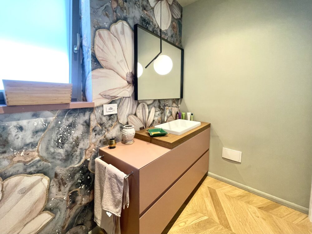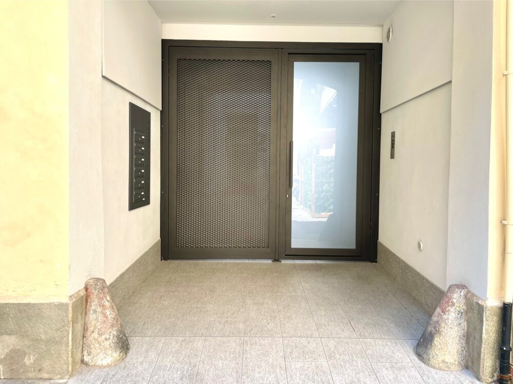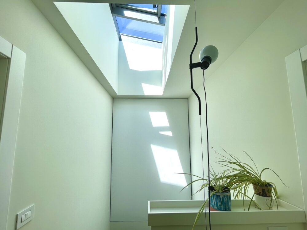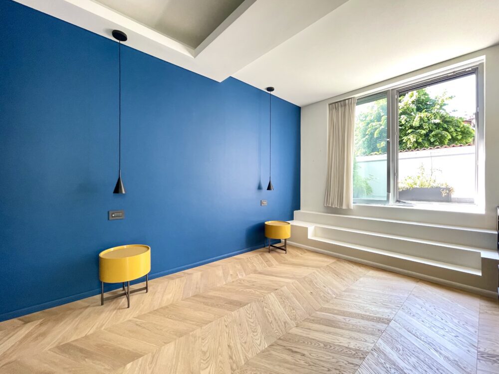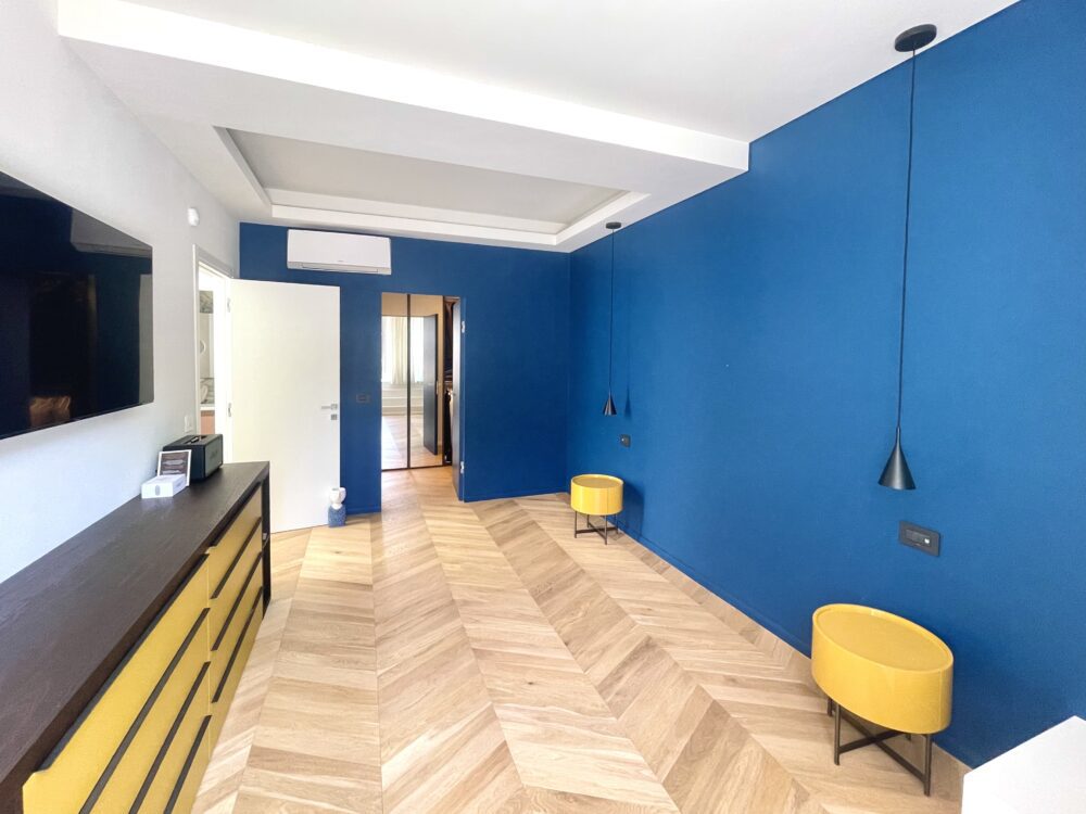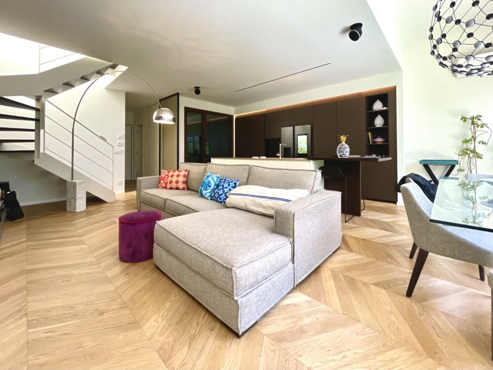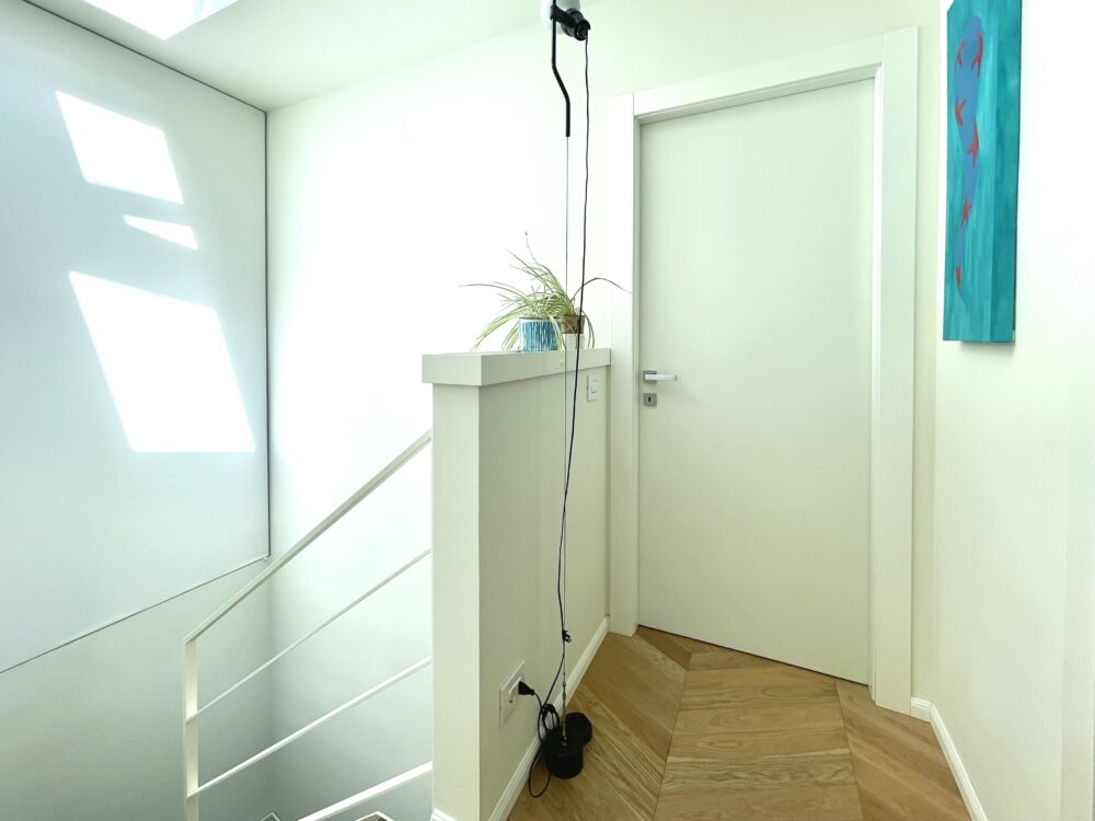 Pavimentazione in parquet a spina ungherese, porta d’ingresso blindata, infissi “Finstral”, tutte le porte interne sono “Dierre” con la sola eccezione della porta a tutta altezza in cristallo realizzata su misura da un artigiano.