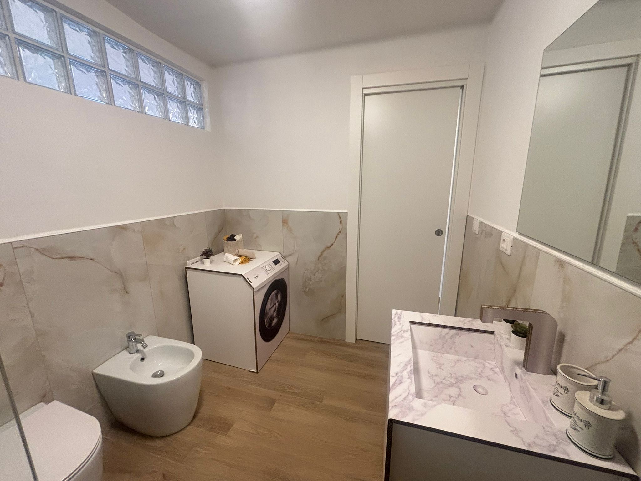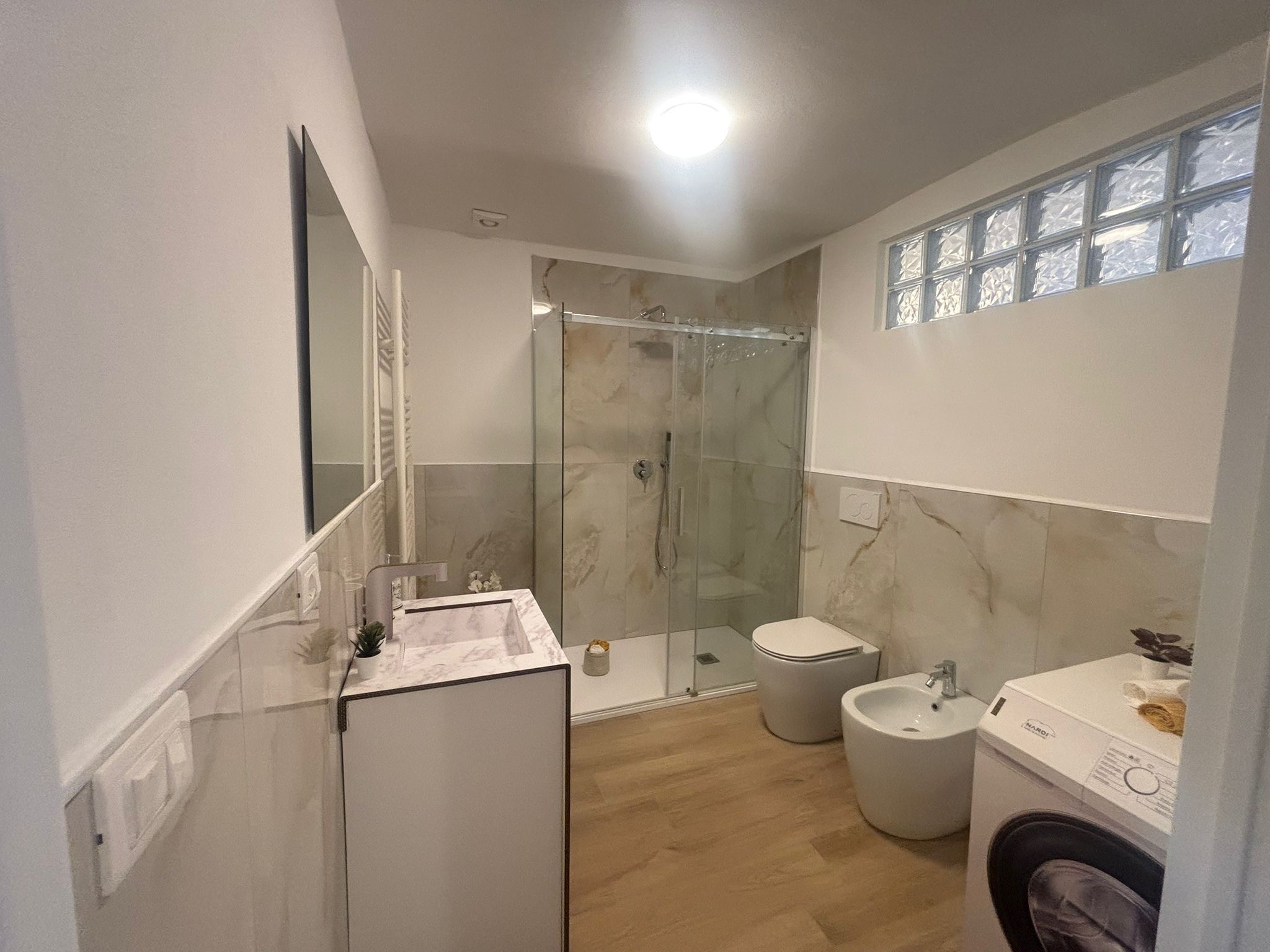 Due bagni con areazione forzata completi di box doccia in cristallo temperato trasparente da 8 mm.