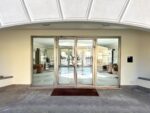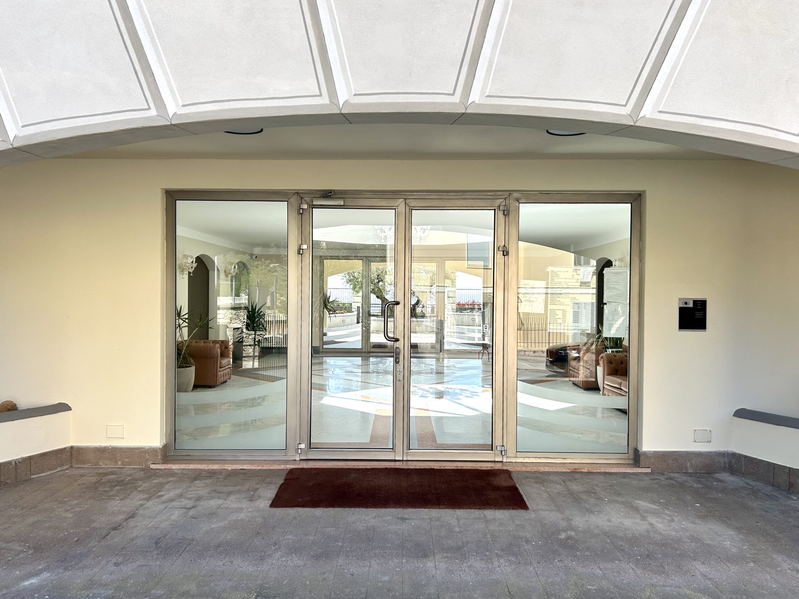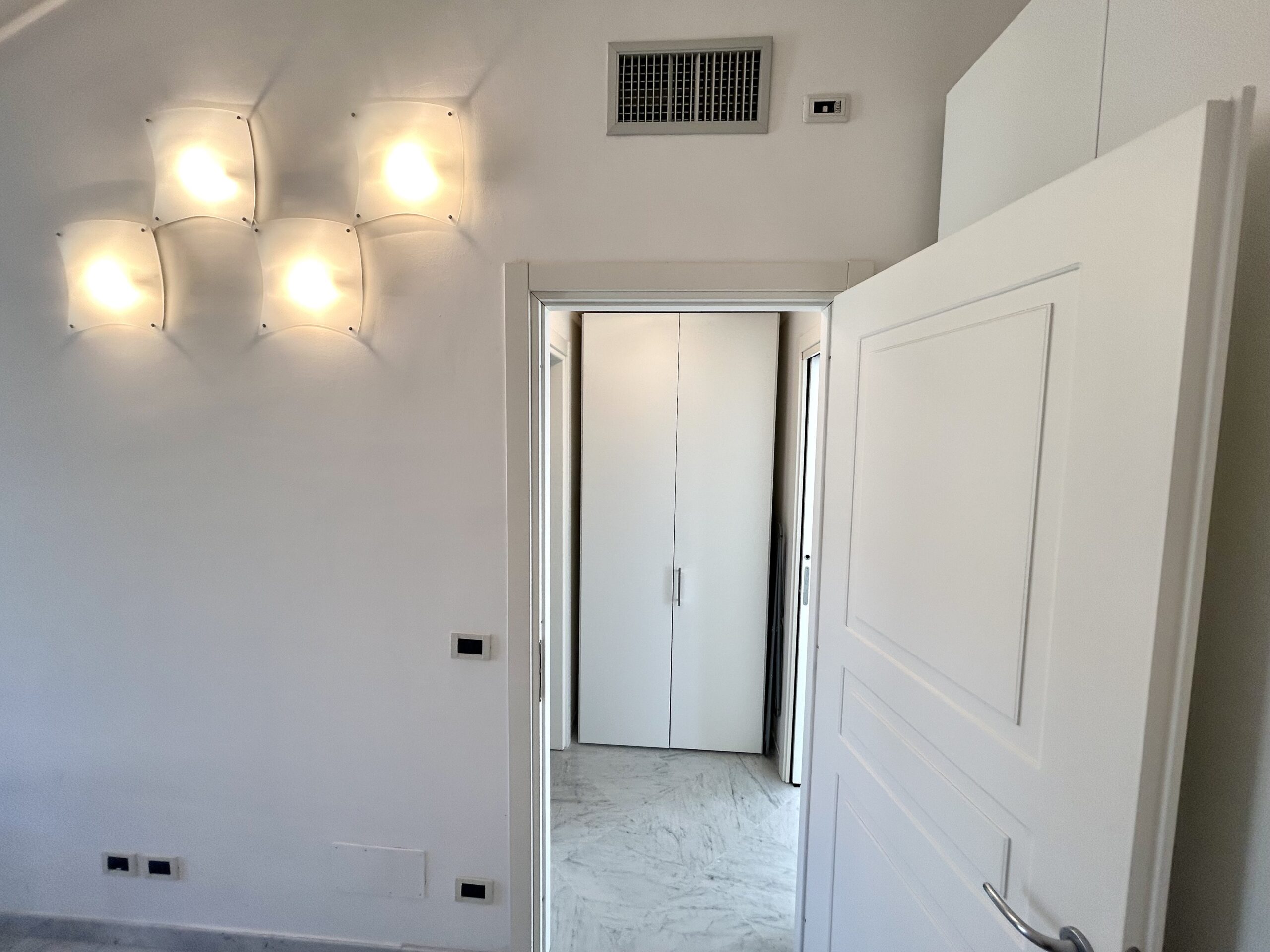 Porta d’ingresso blindata e pavimentazione uniforme in marmo.