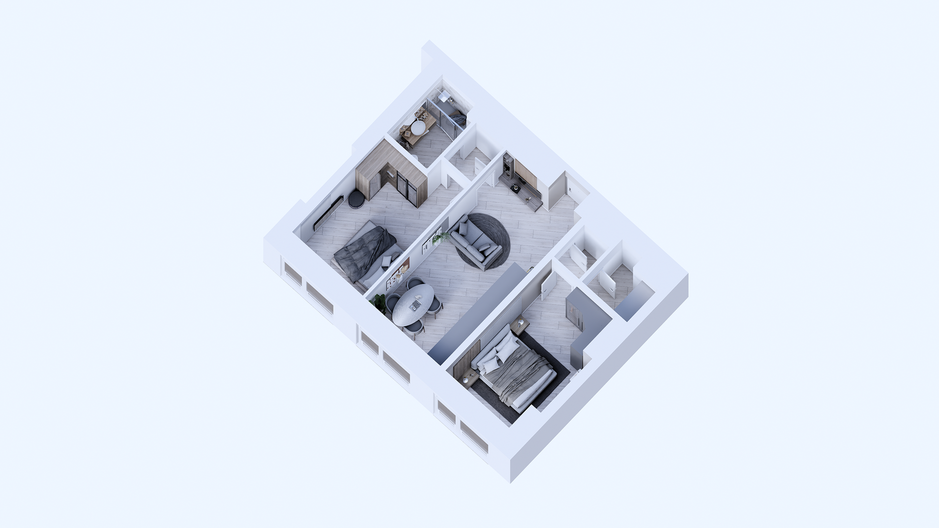 Pavimentazione in gres effetto legno uniforme in tutta la casa.