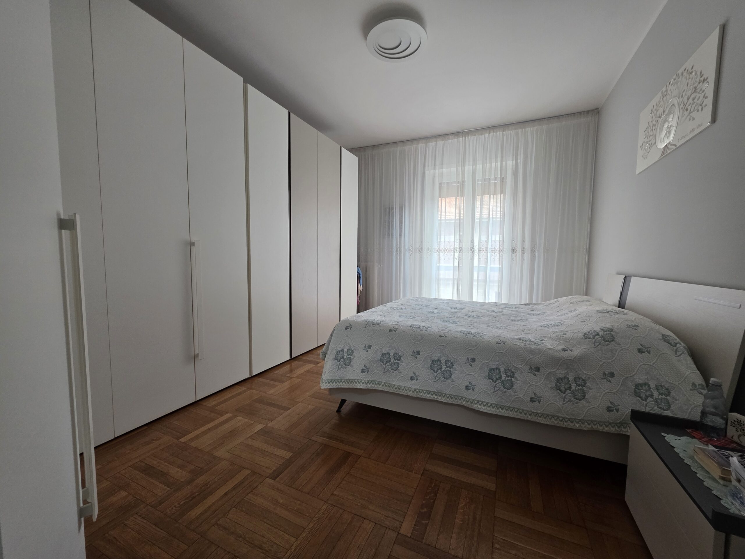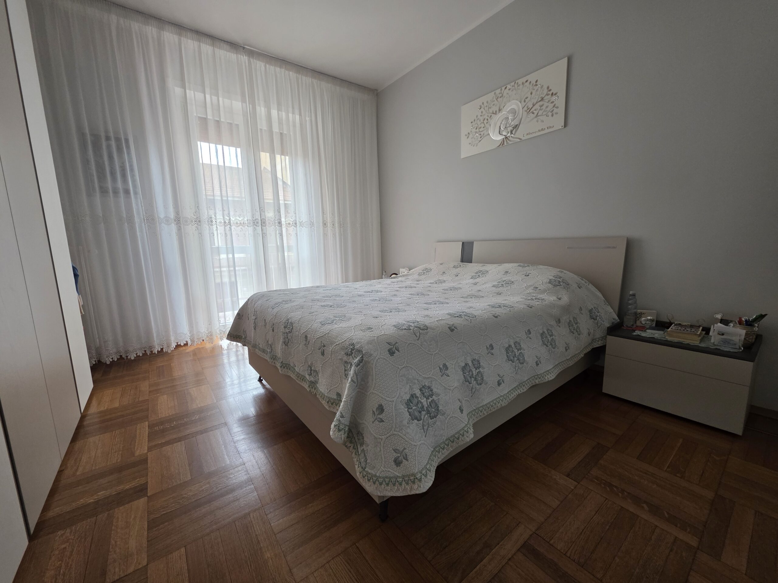 Pavimentazione in gress in quasi tutto l’appartamento tranne nella camera da letto dove c’è il parquet originale.